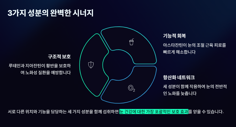 루테인, 지아잔틴, 아스타잔틴은 서로 다른 위치와 기능을 담당하므로, 세 가지를 함께 섭취했을 때 눈 건강에 대한 가장 포괄적인 보호 효과를 얻을 수 있습니다.