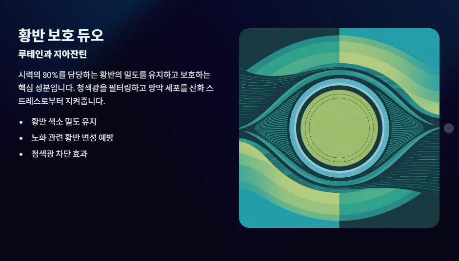 루테인과 지아잔틴은 눈의 가장 중요한 부위인 **황반(시력의 90% 담당)**의 밀도를 유지하고 보호하는 역할을 합니다.