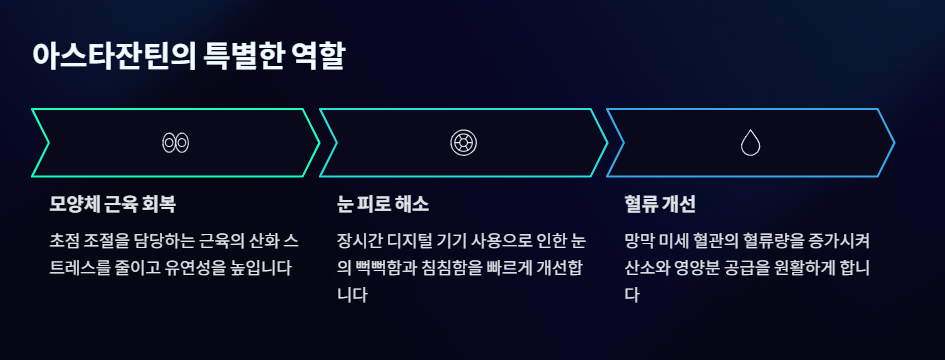 루테인과 지아잔틴이 주로 눈의 내부 구조를 보호하는 '방어막' 역할에 집중한다면, 아스타잔틴은 눈의 근육 피로를 해결하는 '회복제' 역할에 특화되어 있습니다.