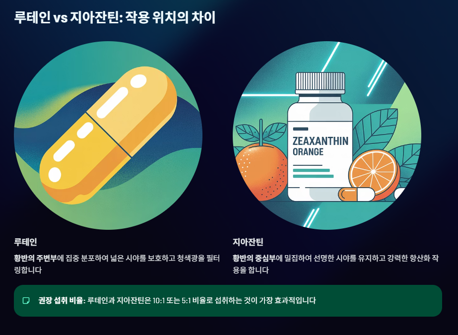| 루테인 | 황반의 주변부 | 황반 색소 밀도 유지, 청색광 필터링 | 지아잔틴과 10:1 또는 5:1 |