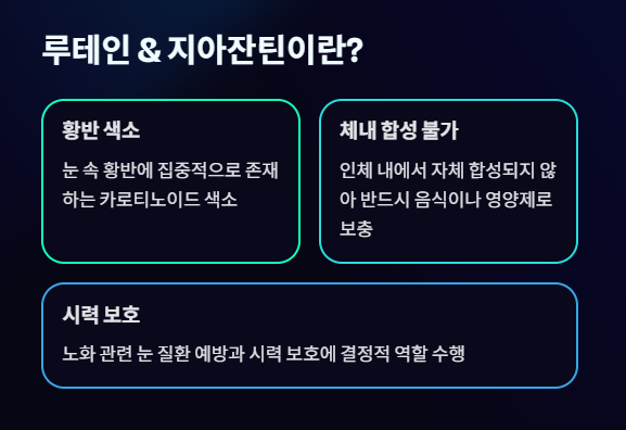 루테인과 지아잔틴은 황반 색소 밀도를 유지하여 황반 변성을 예방하는 핵심 기능을 수행하며, 청색광을 필터링하고 강력한 항산화 작용으로 눈의 피로와 노화를 동시에 막아줍니다. 두 성분을 5:1 또는 10:1의 최적 비율로 함께 섭취하는 것이 가장 효과적입니다.