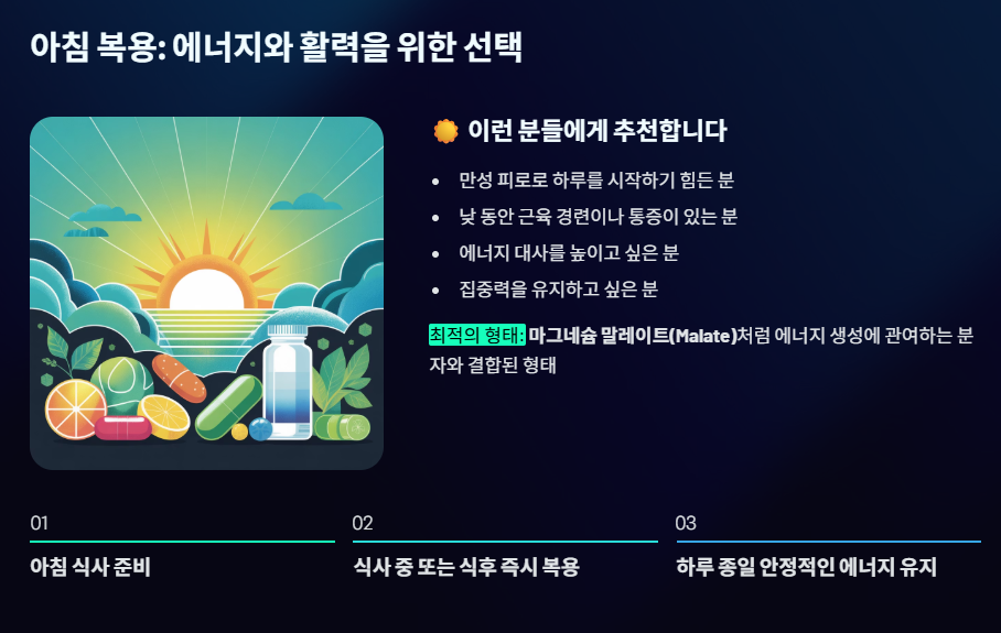- 최적의 형태: **마그네슘 말레이트(Malate)**처럼 에너지 생성에 관여하는 분자와 결합된 형태가 낮 시간 복용에 가장 적합합니다.