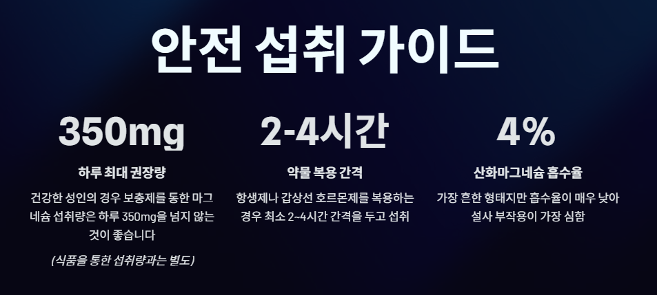 - 최대 안전 용량: 건강한 성인의 경우, 보충제를 통한 마그네슘 섭취량은 하루 350mg을 넘지 않는 것이 좋습니다. (식품을 통한 섭취량과는 별도)