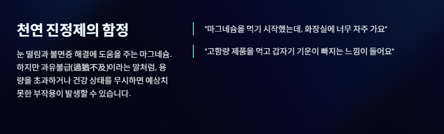 눈 떨림과 불면증을 해결하는 '천연 진정제' 마그네슘은 비교적 안전한 영양제로 알려져 있습니다. 하지만 과유불급(過猶不及)이라는 말처럼, 좋은 마그네슘이라도 용량을 초과하거나 나의 건강 상태를 무시하고 섭취하면 예상치 못한 부작용에 시달릴 수 있습니다.