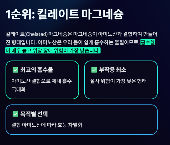 1. 최강의 흡수율과 최소 부작용: 킬레이트 마그네슘 (선택 1순위)