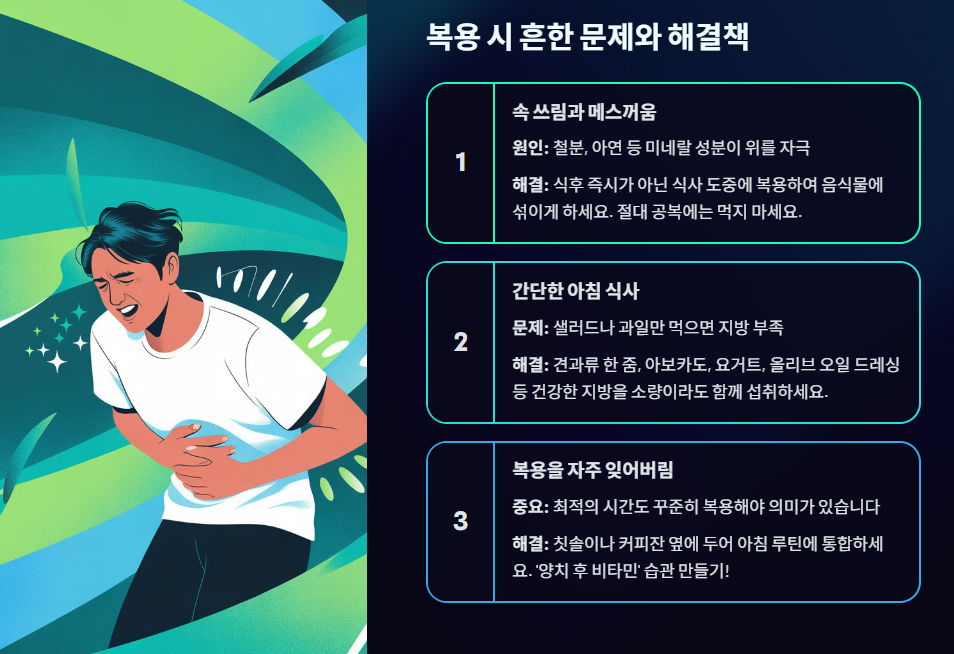 복용 시간을 정했더라도, 개인차가 큰 영양제 특성상 예상치 못한 불편함이 생길 수 있습니다. 이를 해결하는 실전 팁을 정리했습니다.