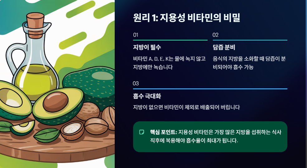 🩸 원리 1: 지용성 비타민의 숙명 (지방이 필수)