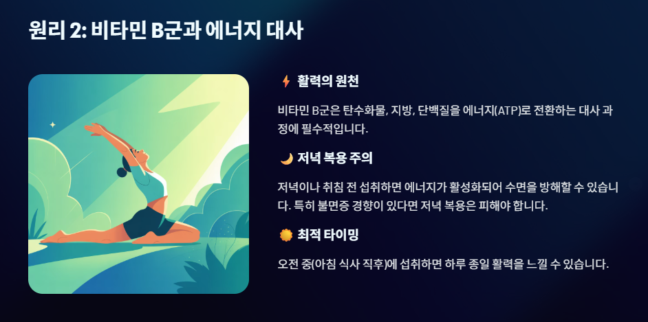 ⚡ 원리 2: 수용성 비타민 B군의 에너지 작용 (밤에 피해야 할 이유)