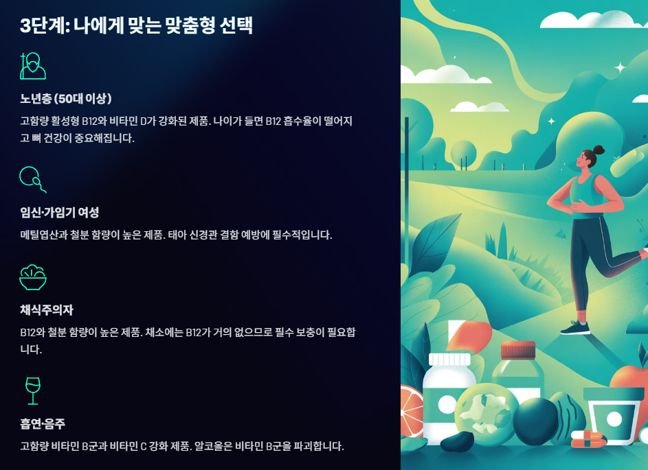 - 노년층 (50대 이상): 나이가 들면 비타민 B12 흡수율이 떨어지므로, 고함량의 활성형 B12와 뼈 건강을 위한 비타민 D 함량이 높은 제품을 선택해야 합니다.