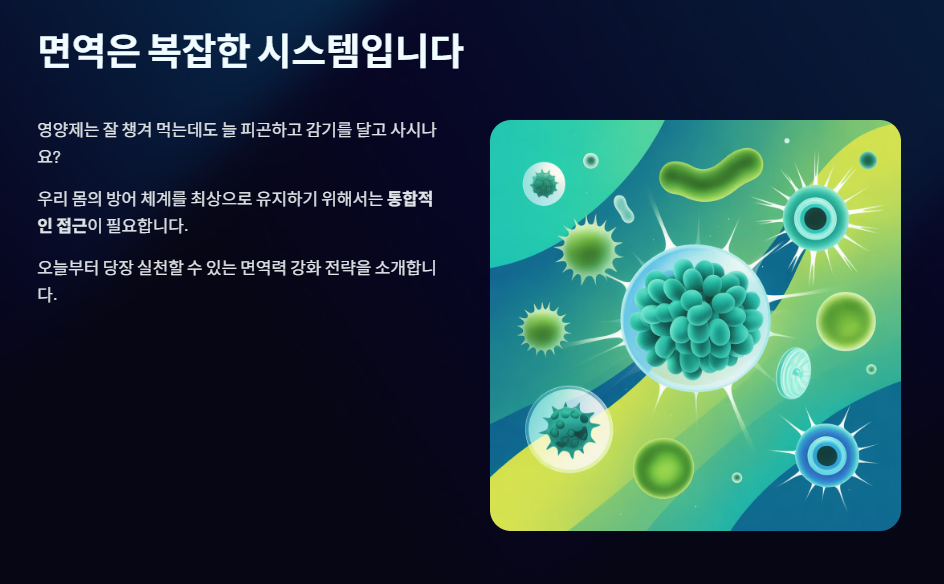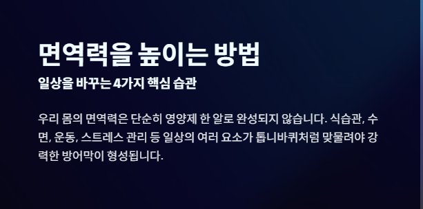 우리 몸의 면역력은 단순히 영양제 한 알로 완성되지 않습니다. 면역은 복잡한 **'시스템'**이기 때문에 식습관, 수면, 운동, 스트레스 관리 등 일상의 여러 요소가 톱니바퀴처럼 맞물려야 강력한 방어막이 형성됩니다.