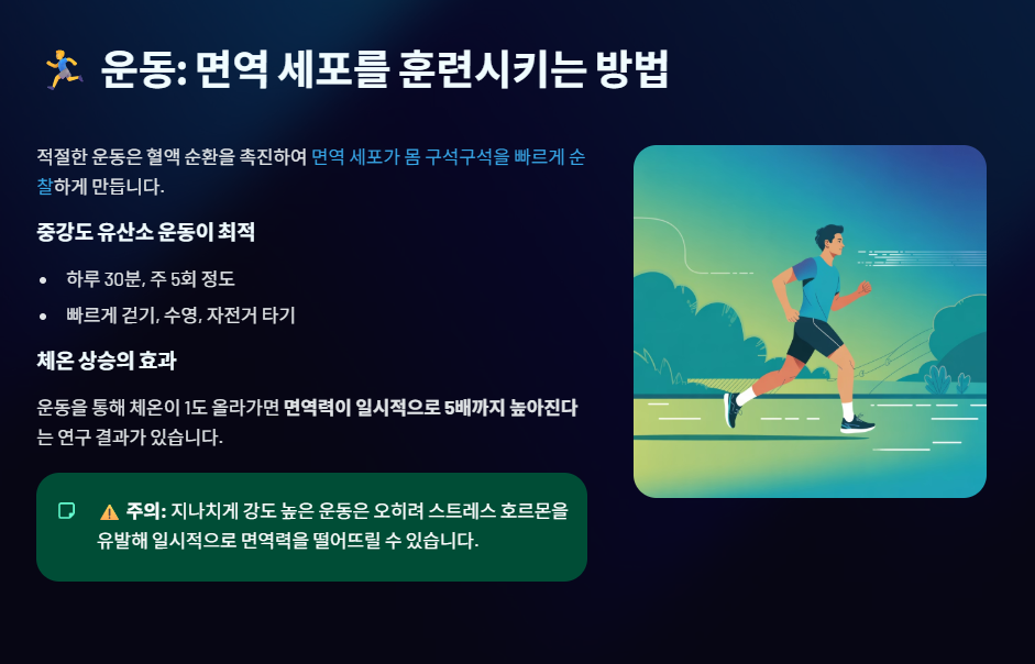- ⚠️ 주의: 지나치게 강도 높은 고강도 운동은 오히려 스트레스 호르몬을 유발해 일시적으로 면역력을 떨어뜨릴 수 있으니 주의하세요.