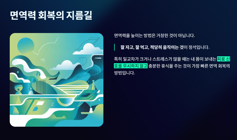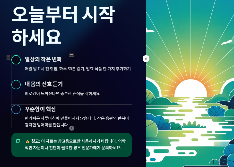 면역력을 높이는 방법은 거창한 것이 아닙니다. 잘 자고, 잘 먹고, 적당히 움직이는 것이 정석입니다. 특히 요즘처럼 일교차가 크거나 스트레스가 많을 때는 내 몸이 보내는 피로 신호를 무시하지 말고 충분한 휴식을 주는 것이 가장 빠른 면역 회복의 지름길입니다.