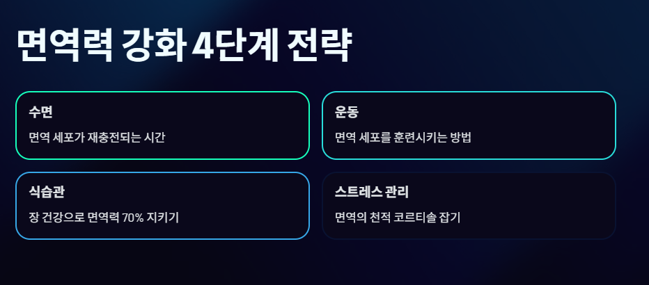 우리 몸의 방어 체계를 최상으로 유지하기 위해 오늘부터 당장 실천할 수 있는 면역력 강화 4단계 전략을 정리해 드립니다.