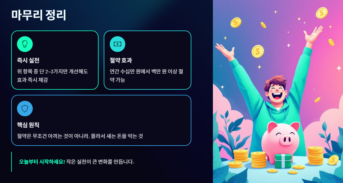 위 항목 중 단 2~3가지만 개선해도 연간 수십만 원에서 백만 원 이상을 절약할 수 있습니다. 절약은 무조건 아끼는 것이 아니라, 몰라서 새는 돈을 막는 것에서 시작됩니다.