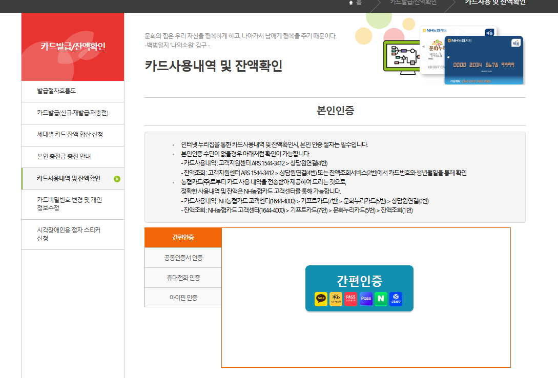 - 웹사이트: 문화누리카드 누리집 접속 → 카드발급/잔액확인 → 본인 인증 후 조회