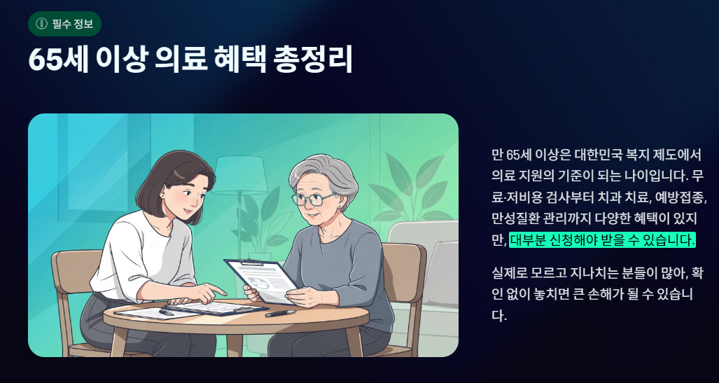 65세 이상이라면 꼭 챙겨야 할 의료 혜택을 한눈에 정리했습니다. 건강검진·예방접종·임플란트·틀니·치매검진부터 의료비 감면, 만성질환 지원까지 2026년 최신 기준으로 쉽게 설명합니다.