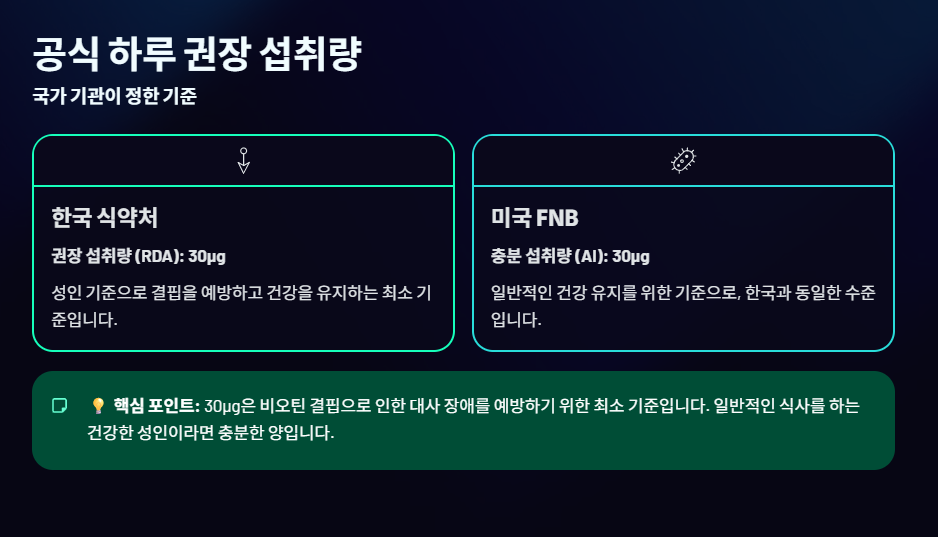 💡 분석 결론: 30µg은 비오틴 결핍으로 인한 대사 장애를 막고 건강을 유지하기 위한 최소 기준입니다. 일반적인 식사를 하는 건강한 성인이라면 이 정도 용량만으로도 충분합니다.