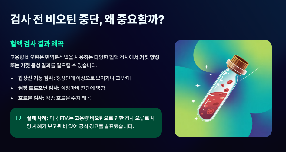 - 가이드: 혈액 검사나 건강 검진을 받기 최소 2~3일 전에는 비오틴 복용을 중단해야 합니다.