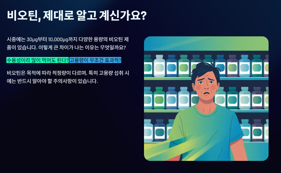 혹시 비오틴은 수용성이라 무조건 많이 먹어도 된다고 생각하시거나, 고용량 제품이 무조건 더 효과가 좋을 거라고 기대하고 계시진 않나요?