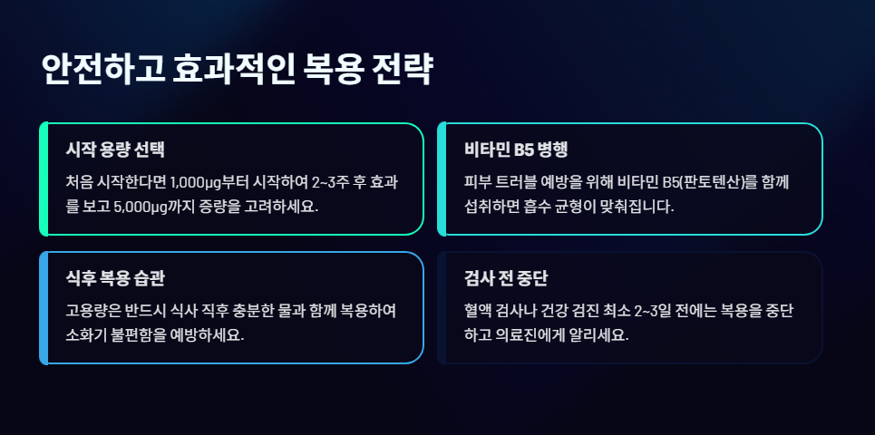 - 가이드: 고용량 비오틴은 반드시 식사 직후에 충분한 물과 함께 복용하여 위장 자극을 최소화해야 합니다.
