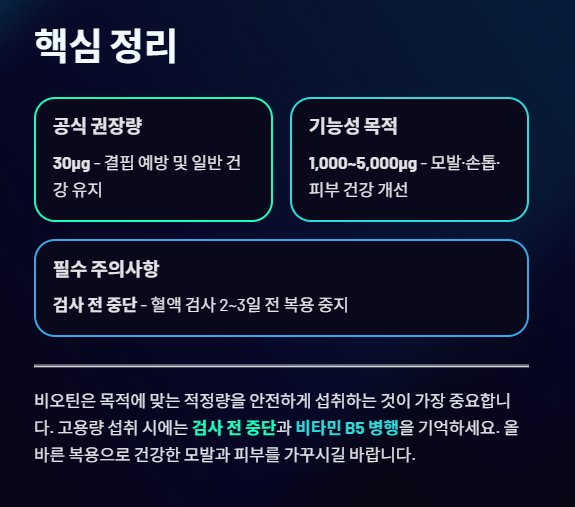 비오틴은 필요에 따라 적정량을 섭취하는 것이 중요하며, 목적에 따라 권장량이 달라집니다. 특히 모발 건강을 위해 고용량을 섭취할 때는 반드시 알아야 할 주의사항이 있습니다.