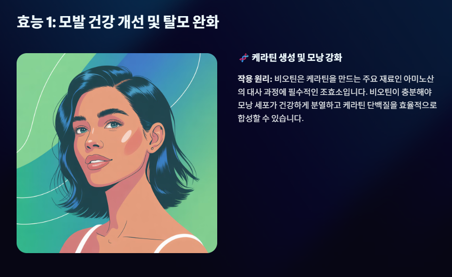 비오틴이 가장 유명해진 이유이자 핵심 효능입니다. 비오틴은 모발의 주성분인 케라틴 구조를 강화하여 모발의 밀도와 강도를 개선합니다.