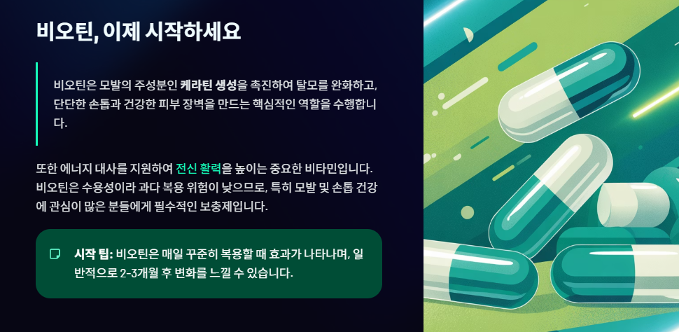 비오틴은 모발의 주성분인 케라틴 생성을 촉진하여 탈모를 완화하고, 단단한 손톱과 건강한 피부 장벽을 만드는 핵심적인 역할을 수행합니다. 또한 에너지 대사를 지원하여 전신 활력을 높이는 중요한 비타민입니다. 비오틴은 수용성이라 과다 복용 위험이 낮으므로, 특히 모발 및 손톱 건강에 관심이 많은 분들에게 필수적인 보충제입니다.