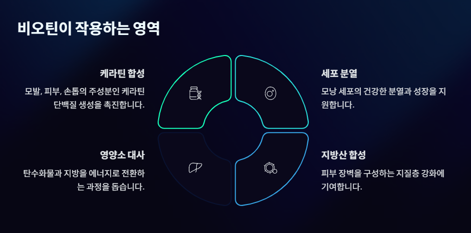 비오틴은 모발뿐만 아니라 피부 세포와 손톱의 건강에도 직접적으로 관여합니다.