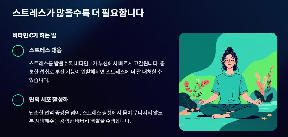 - 스트레스 대응: 스트레스를 받을수록 비타민 C가 부신에서 빠르게 고갈됩니다. 평소 비타민 C를 충분히 섭취하면 부신 기능이 원활해져 스트레스에 더 잘 대처할 수 있는 힘이 생깁니다.
