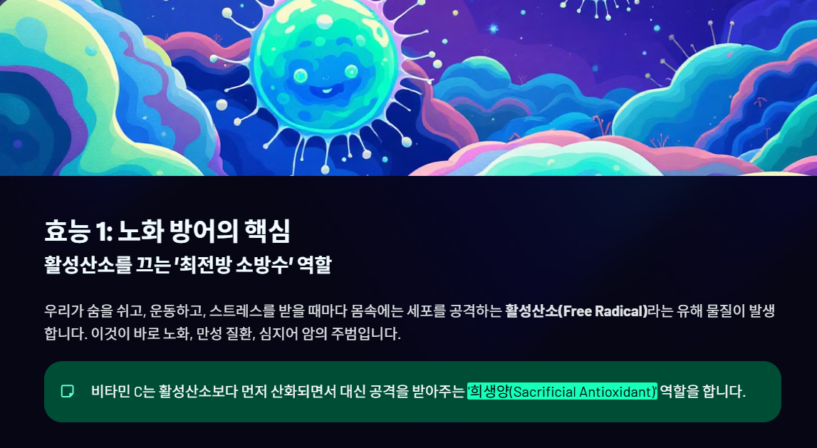 대부분의 사람들은 "비타민 C가 좋다더라" 정도로만 알고 섭취하지만, 정확히 어떤 원리로 우리의 몸을 지키는지 이해하면 섭취를 빼먹지 않고 꾸준히 챙기게 될 겁니다.