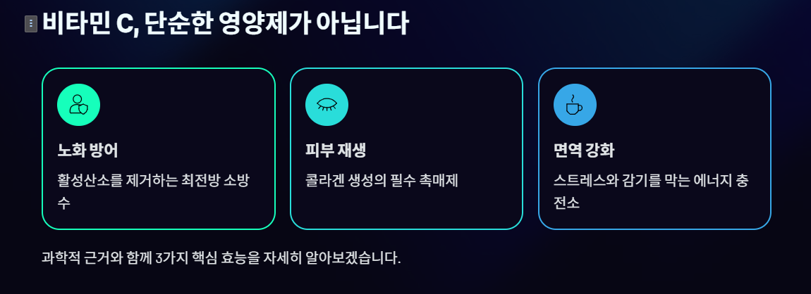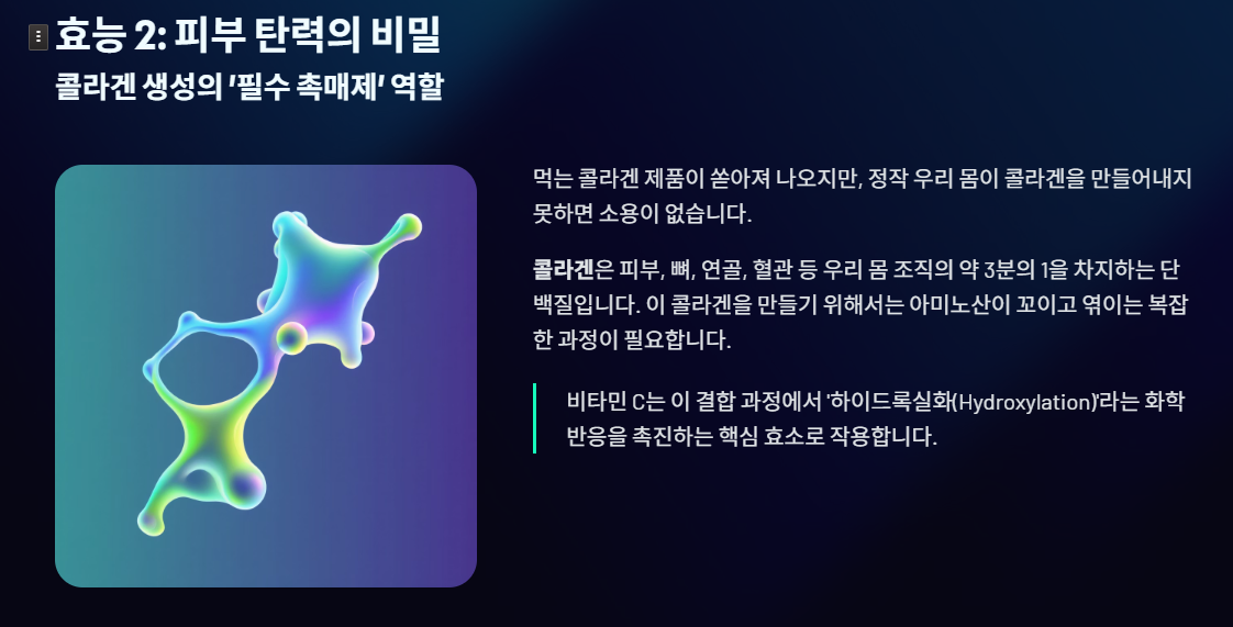 따라서 비타민 C는 단순한 보조제가 아니라, 젊음과 재생력을 유지하는 데 필요한 핵심 건축 자재라고 할 수 있습니다.