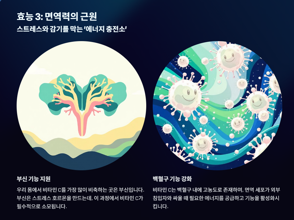 이처럼 비타민 C는 단순한 면역 증강을 넘어, 스트레스 상황에서 몸이 무너지지 않도록 지탱해주는 강력한 배터리 역할을 수행합니다.
