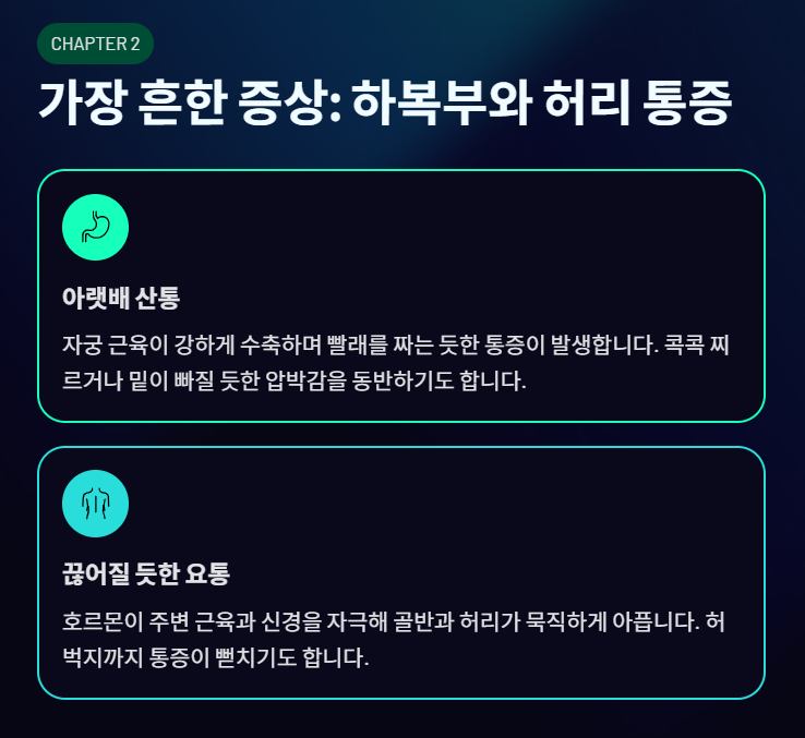 오늘 이 글에서는 아랫배 통증부터 시작해 우리를 당황하게 만드는 전신 증상까지, 생리통의 다양한 모습들을 아주 구체적이고 쉽게 파헤쳐 드릴게요. 내 몸이 보내는 신호를 정확히 읽고, 이번 달은 조금 더 현명하게 고통을 이겨낼 수 있는 해결책을 함께 찾아볼까요?