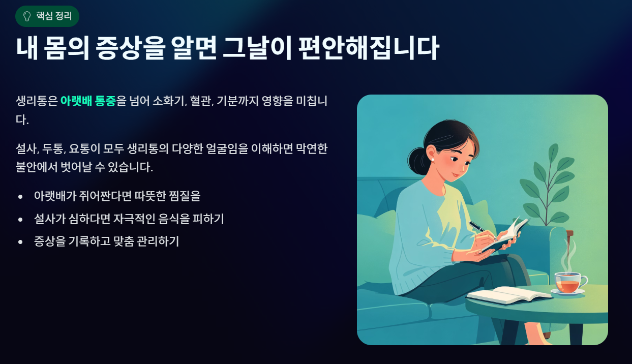 생리통은 단순히 '배의 통증'에만 머물지 않습니다. 우리 몸 전체의 컨디션을 흔들어놓기도 하죠.