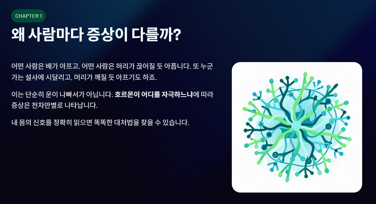 도대체 왜 생리통은 이렇게 사람마다, 그리고 매달 다르게 나타나는 걸까요? 단순히 운이 나빠서 그런 것이 아닙니다. 우리 몸속 호르몬이 어디를 자극하느냐에 따라 증상은 수만 가지 얼굴로 나타날 수 있거든요. 내가 겪는 이 증상이 정말 생리통 때문이 맞는지, 왜 이런 증상이 생기는지 정확히 알면 그에 맞는 똑똑한 대처법도 찾을 수 있습니다.