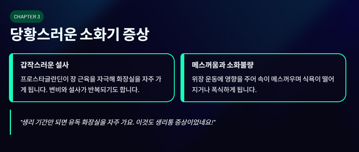 생리 기간만 되면 유독 화장실을 자주 가거나 변비와 설사가 반복되는 분들 계시죠? 이는 생리통 유발 물질인 '프로스타글란딘'이 장 근육까지 자극하기 때문입니다. 장이 과도하게 움직이면서 설사를 유발하고, 위장 운동에도 영향을 주어 속이 메스꺼우거나 소화가 안 되는 느낌을 받게 됩니다. 식욕이 뚝 떨어지거나 반대로 폭식을 하게 되는 것도 이 호르몬의 영향이 큽니다.