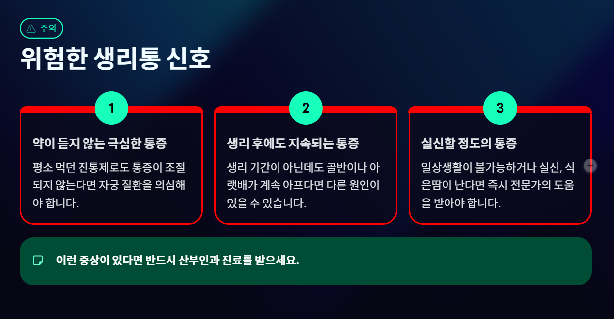 모든 생리통 증상이 정상인 것은 아닙니다. 만약 다음과 같은 증상이 나타난다면 반드시 주의 깊게 살펴봐야 합니다.