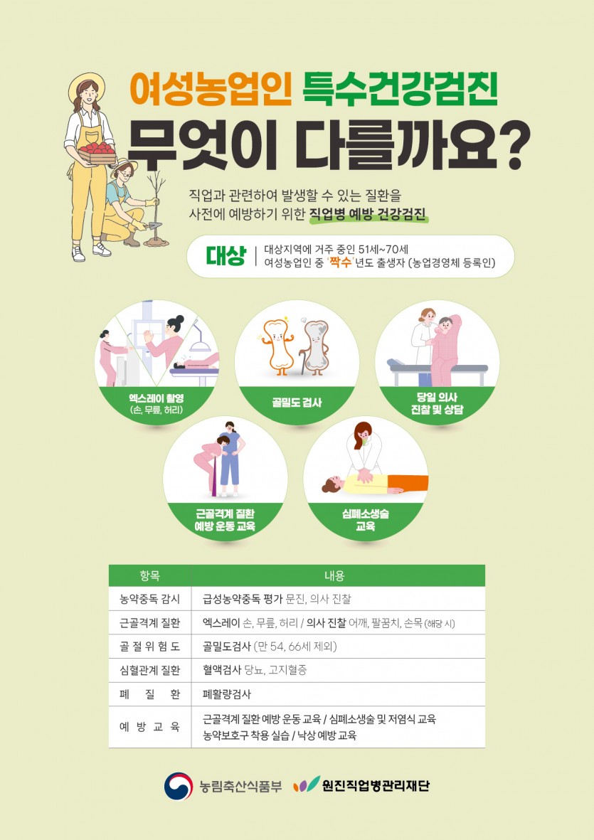 이를 예방하기 위해 2024년부터 본격적으로 시행된 **「여성농업인 특수건강검진」**은