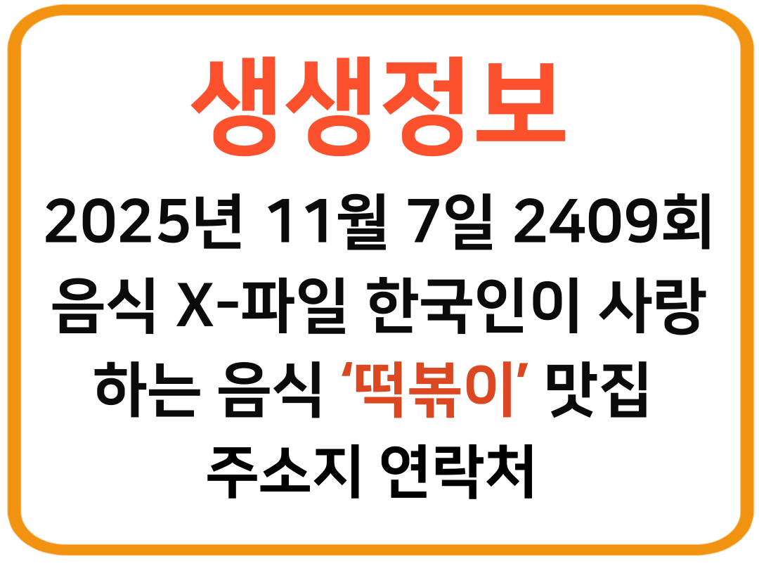 생생정보 2025년 11월 7일 2409회 음식 X-파일 한국인이 사랑하는 음식 ‘떡볶이’ 맛집 따봉하우스