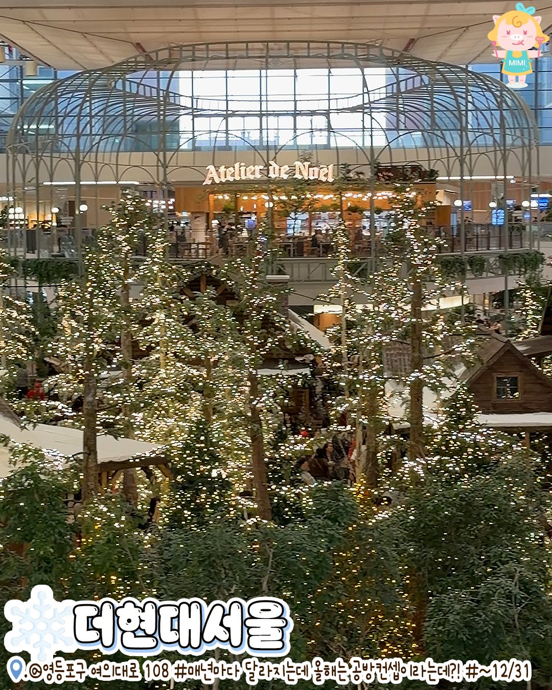 하이라이트: 대형 실내 트리, 겨울 팝업 전시, 포토존. 실내 공간이라 날씨에 상관없이 겨울 분위기를 즐길 수 있습니다.