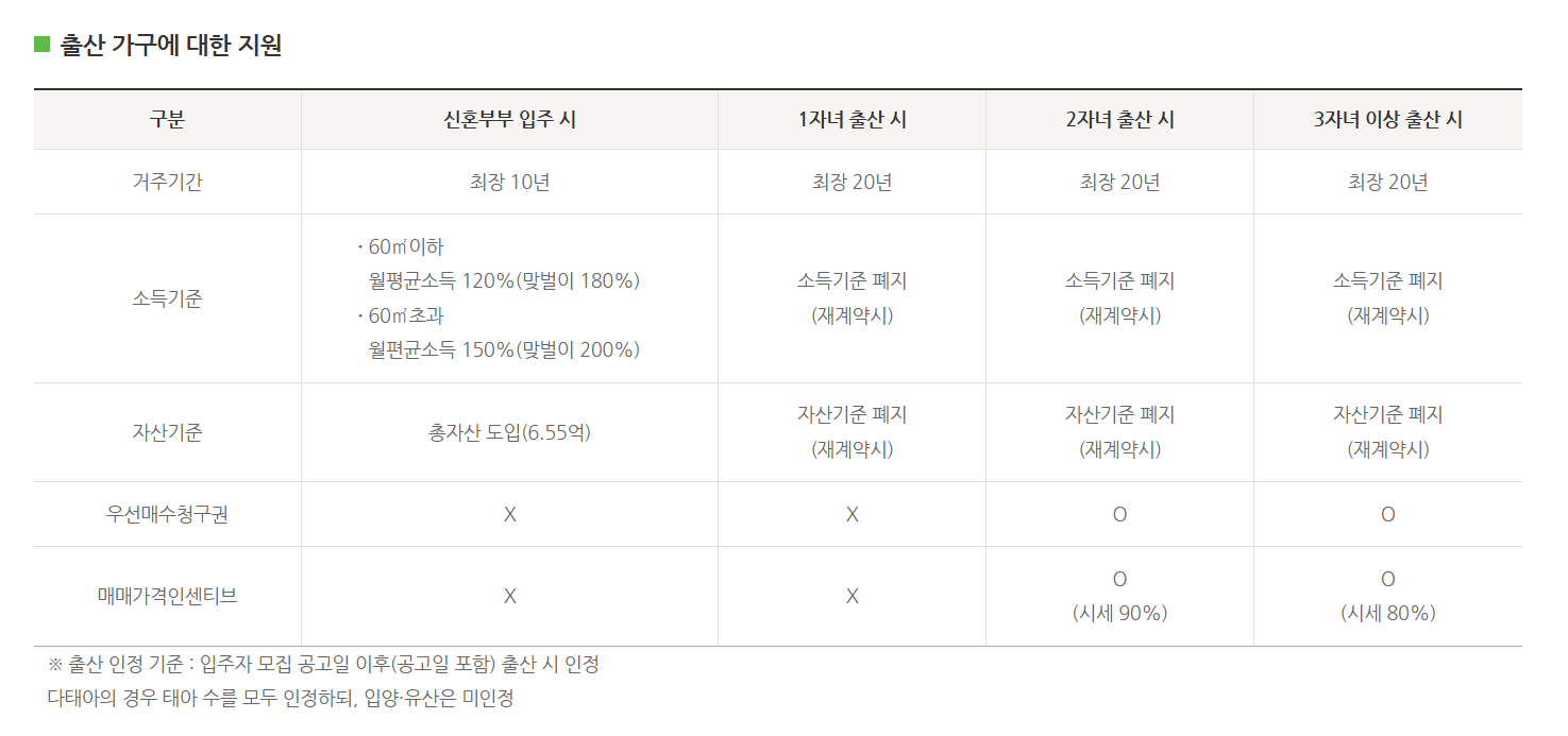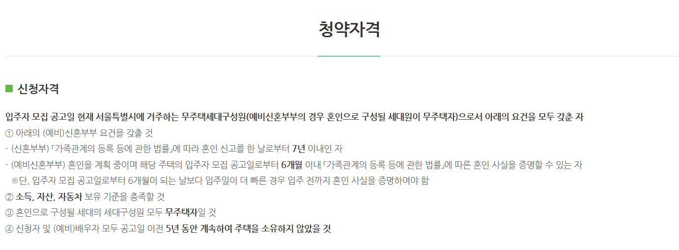 - 소득 및 자산, 자동차 보유 기준 충족 필요 (예: 전용 60㎡ 이하 월평균 소득 120% 이하 등)