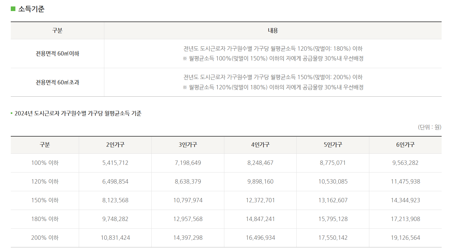 - 소득 및 자산, 자동차 보유 기준 충족 필요 (예: 전용 60㎡ 이하 월평균 소득 120% 이하 등)