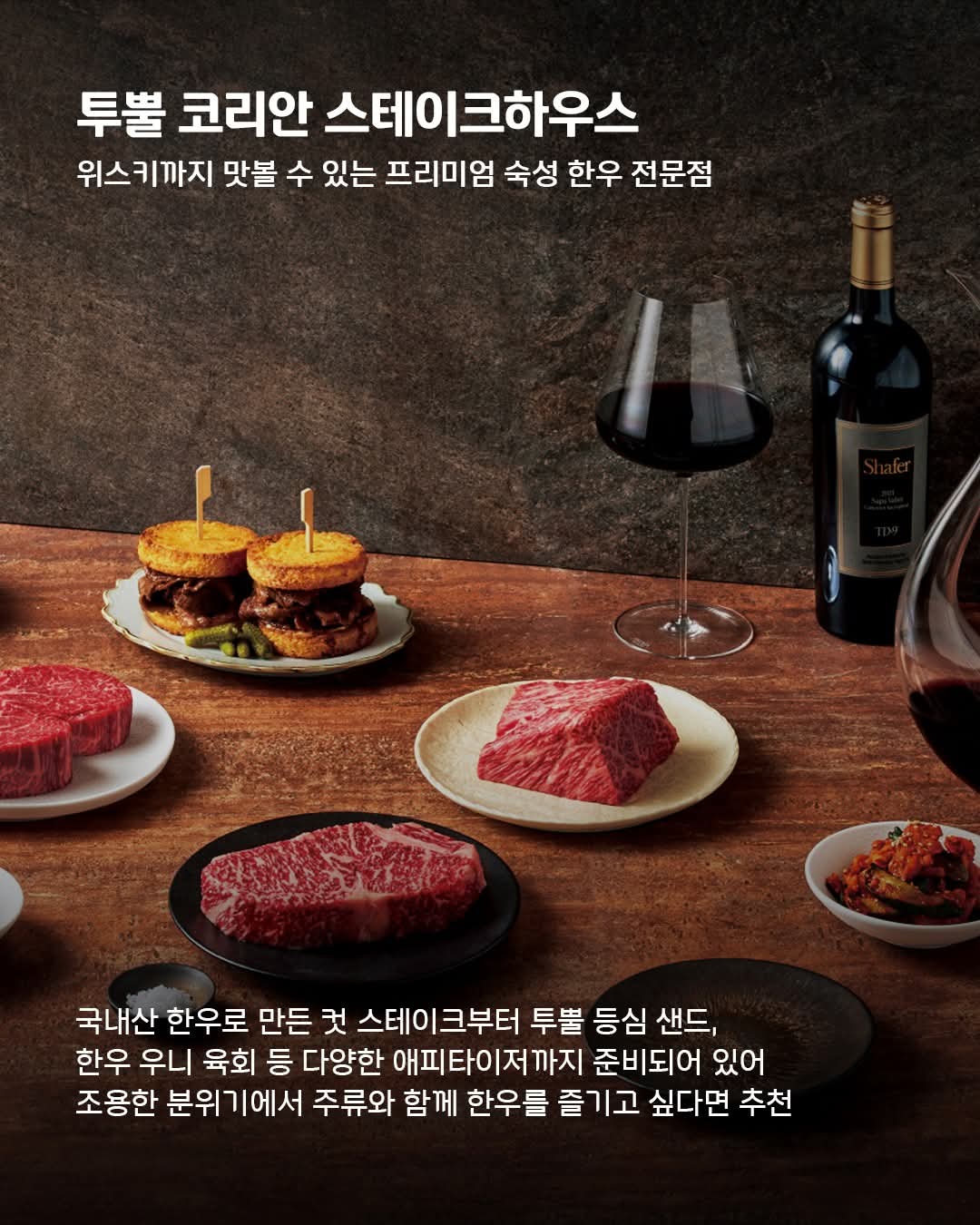 투뿔 코리안 스테이크하우스는 이름 그대로 한우 투뿔 등급의 정점을 보여준다. 한우 등심 스테이크, 우니육회, 두툼한 투뿔 버거까지 각 메뉴는 프렌치 다이닝의 정제미와 한식의 깊이를 결합했다.