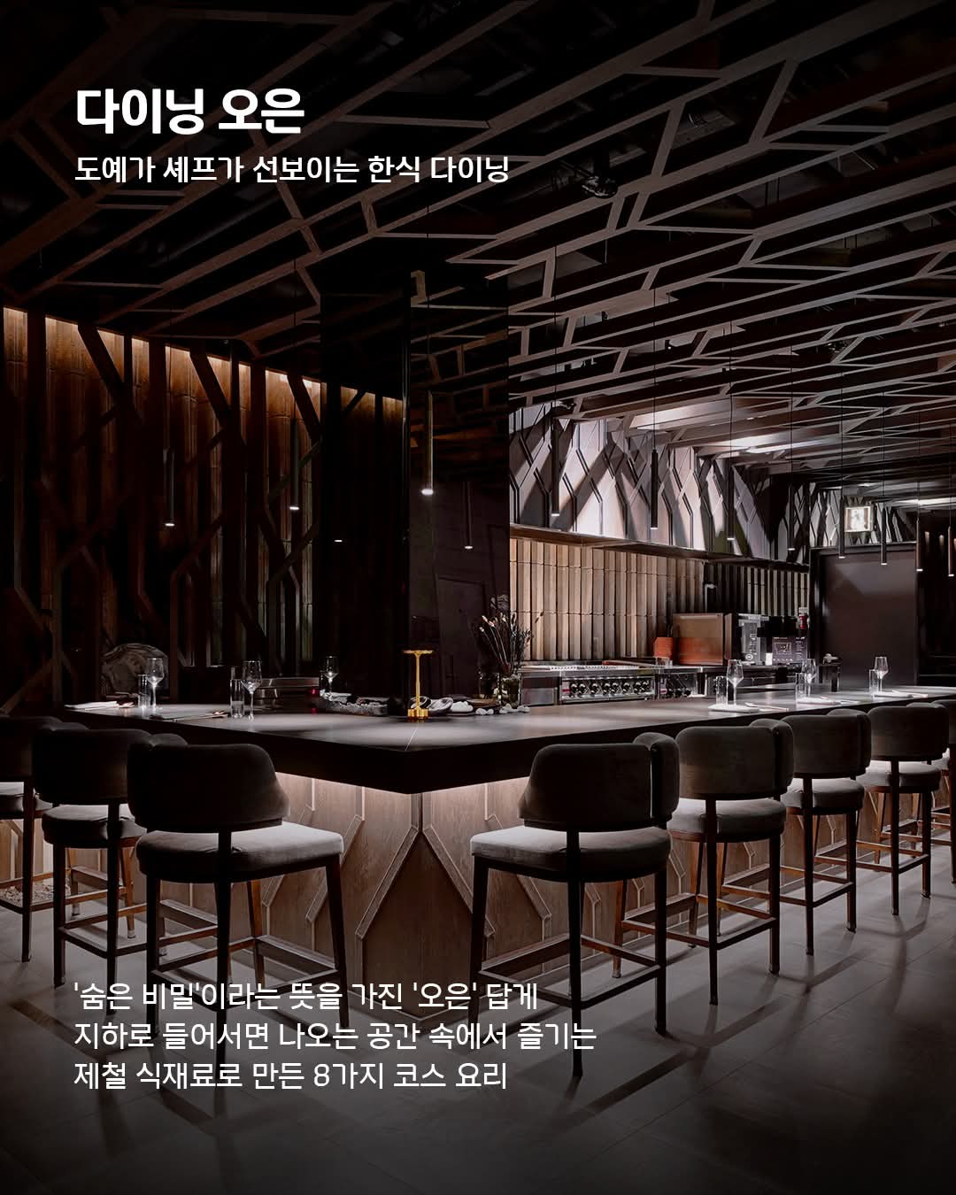 ‘숨은 비밀’이라는 뜻을 가진 오은(OON)은 지하로 내려가야 만날 수 있는 비밀스러운 다이닝 공간이다. 도예가 출신 셰프가 만든 식기와 제철 식재료가 어우러진 8코스 한식은 ‘한국 미학의 극치’라는 평가를 받는다. 부드러운 조명과 우드톤 인테리어, 미니멀한 동선까지 — 식사 자체가 하나의 전시처럼 느껴지는 공간이다.