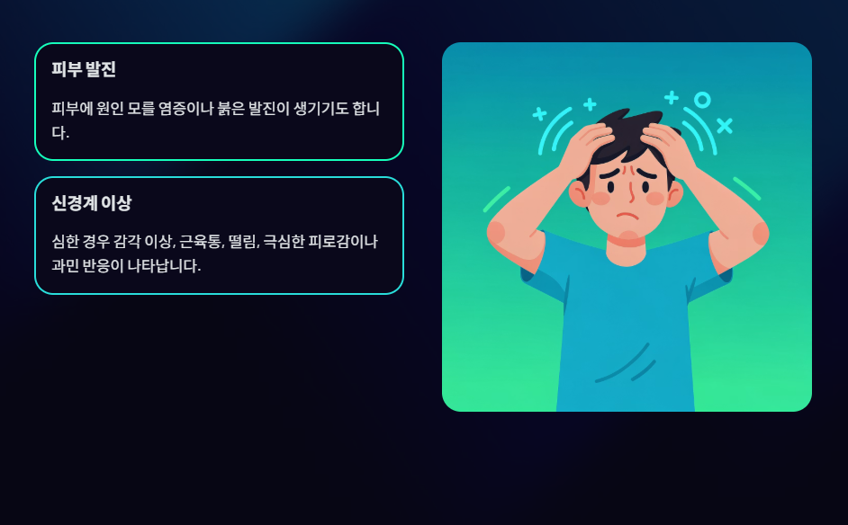 - 신경계 이상: 심한 경우 감각 이상, 근육통, 떨림, 극심한 피로감이나 과민 반응이 나타납니다.
