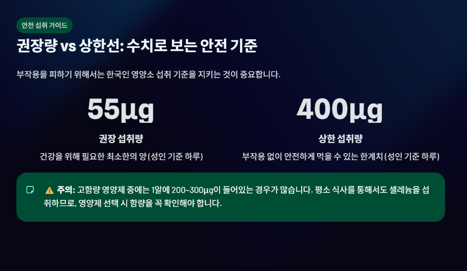⚠️ 주의: 고함량 영양제 중에는 1알에 200~300μg이 들어있는 경우가 많습니다. 평소 식사(생선, 육류 등)를 통해서도 셀레늄을 섭취하므로, 영양제 선택 시 함량을 꼭 확인해야 합니다.