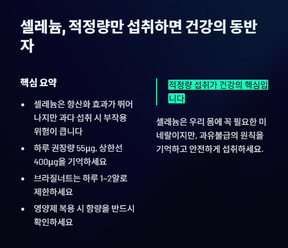 셀레늄은 우리 몸에 꼭 필요한 필수 미네랄이지만, 적정량과 독성 유발량 사이의 간격이 매우 좁은 **'양날의 검'**과 같은 영양소입니다. 따라서 정확한 수치를 알고 섭취하는 것이 무엇보다 중