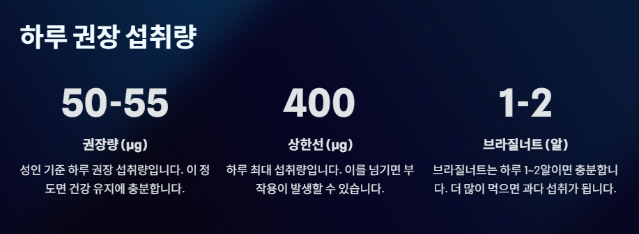 - 과다 섭취 부작용: 손톱이 부서지거나 탈모, 피로감, 신경계 장애, 마늘 냄새 같은 불쾌한 구취 등이 나타날 수 있습니다. (특히 브라질너트를 과하게 먹을 때 주의 필요)