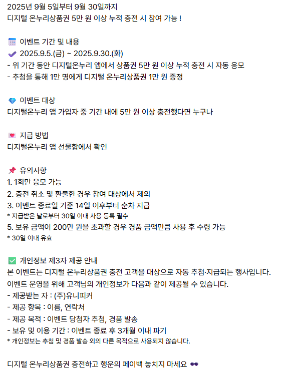 - 당첨자 발표·경품 수령 — 당첨 시 앱 푸시/문자/마이페이지에서 안내. 지급 방식은 디지털온누리상품권(충전) 등으로 제공됩니다.