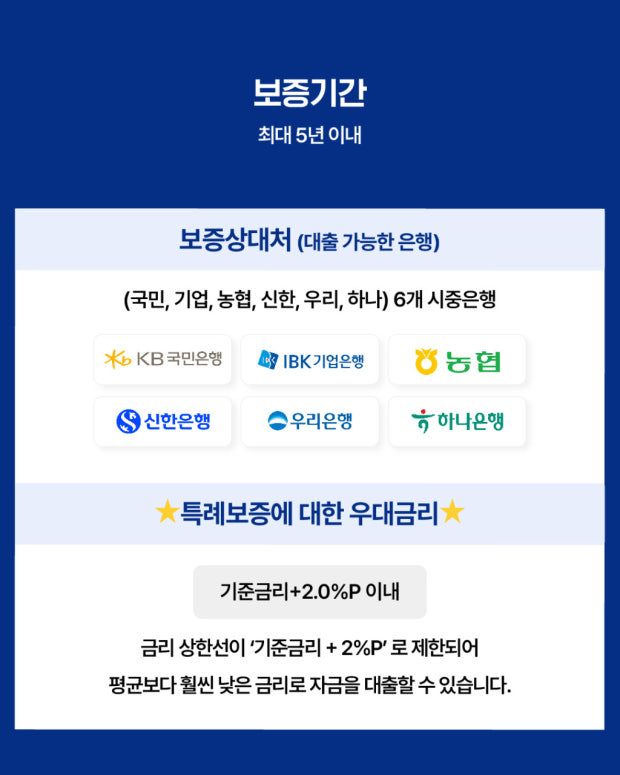 보증 승인 후, 제휴된 은행에서 대출 실행 (우리은행, 국민은행, 농협 등)
